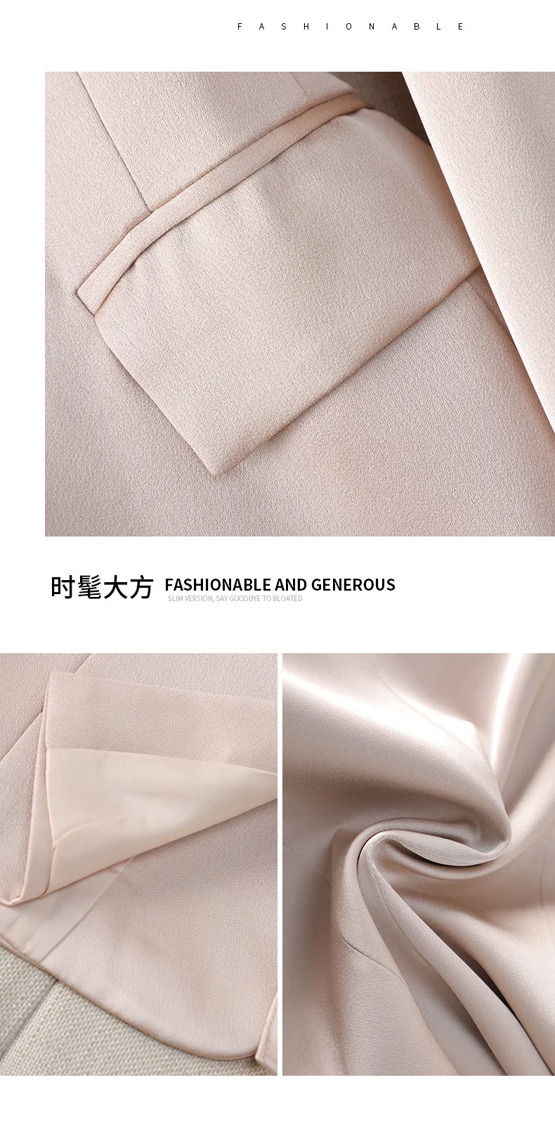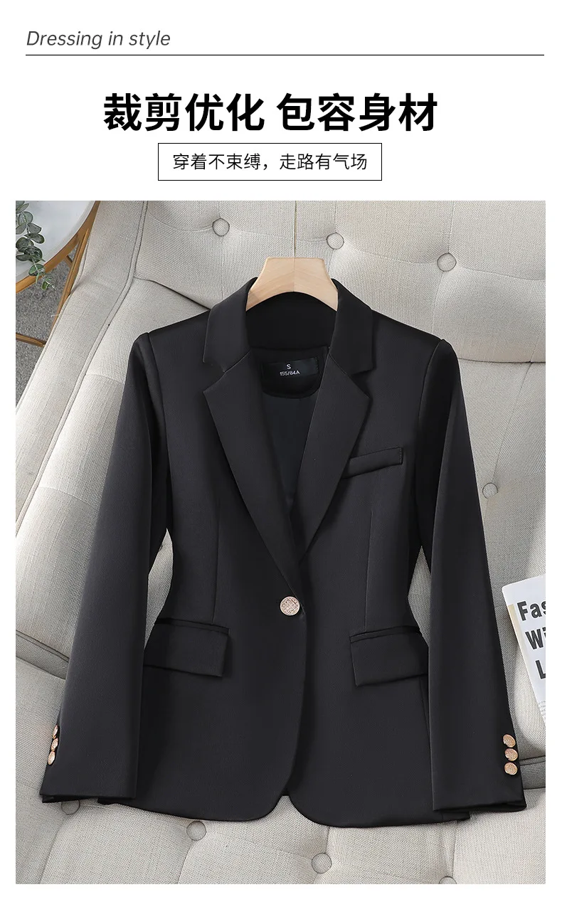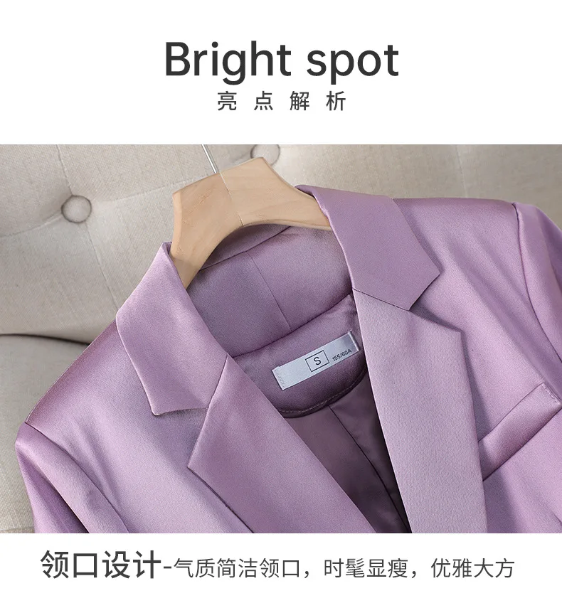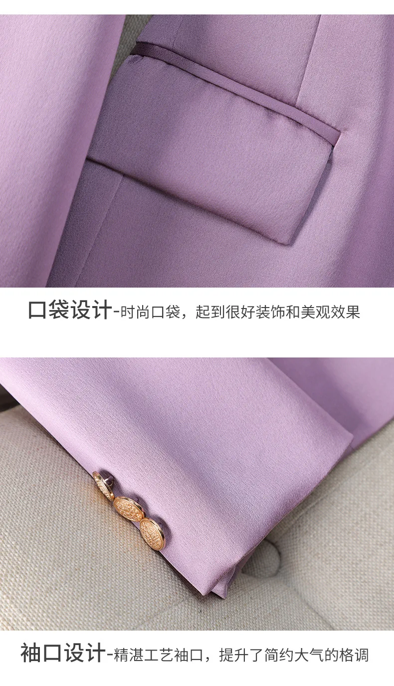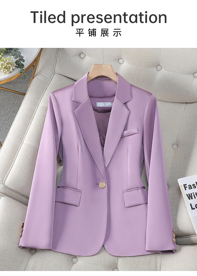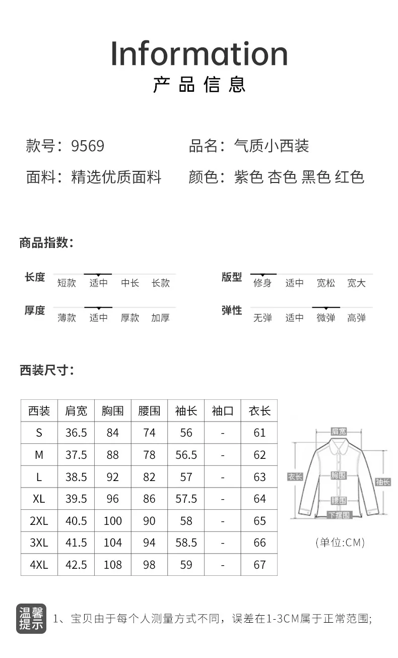 - color: Black blazer, purple blazer, red blazer, apricot blazer